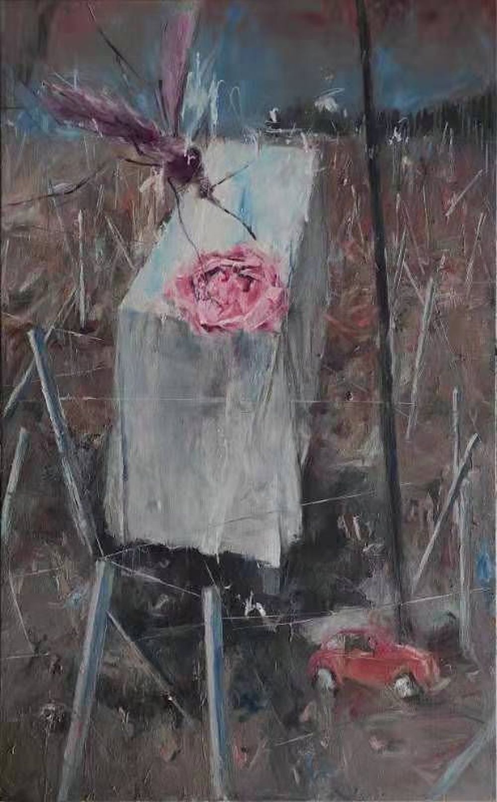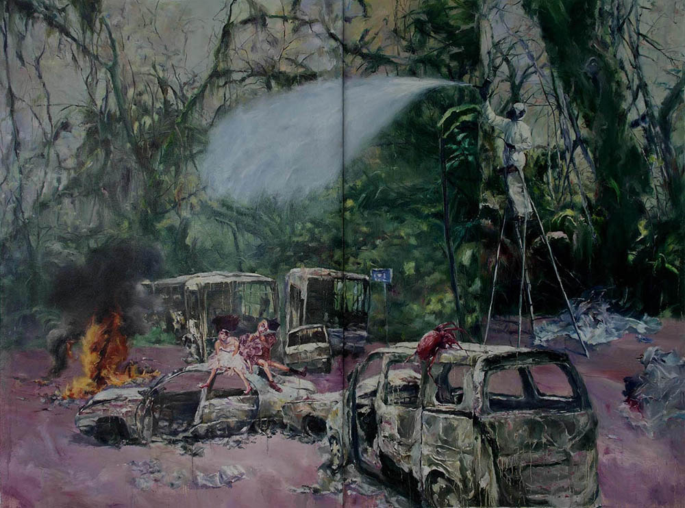 Mit den Autos, den Baumfäule, den koketten Frauen und den seltsamen Insekten ist „Landscape Narrative“ voller kafkaesker Metaphern. Das Auto ist zweifellos eines der wichtigsten Elemente, mit seinem frühen Erscheinen in der Serie „Urban Landscape“ des Malers vor zehn Jahren, das den Aufstieg der Städte und die Erweiterung der Moderne mit einer Art Optimismus innerhalb des damaligen Gemäldes widerspiegelt. In der „Landscape Narrative“ zehn Jahre später ist das Auto jedoch verrostet und beschädigt, der Erzverbrecher des postmodernen urbanen Symptoms und des schrillen Klangs im Ensemble der „Landscape Narrative“. Der Maler verbindet Gegenwart und Zukunft, Realität und Fantasie mit der freien und symbolisierten Kunstsprache, die uns plötzlich über Zeit, Leben und Existenz seufzen lässt. Wenn das Auto als Symbol der menschlichen Katastrophe im postindustriellen Zeitalter wahrgenommen werden kann, sind die Frauen jedoch ein Symbol voller Widersprüche. Es ist einerseits Gegenstand von Verlangen, Unruhe, Gleichgültigkeit und Depression, andererseits Gegenstand der Zerstörung, Entfremdung und Zerstörung. In der Umarmung in der Nacht, der unbeschreiblichen Nacht und der Braut, die Fotos macht, werden die Schönheit und Wärme von Frauen durch die eschatologischen Szenen zerstört, wobei die Aufrichtigkeit des Pfirsichblütengesichtes verschwunden ist, nur der verblassende Wohlstand und die Seltsamkeit und Absurdität der leeres Land übrig. Dies ist eine Ära des Fetischismus und auch eine Ära, die völlig von der erwarteten modernen Wohlfahrt abweicht. Die Frau, die im gefallenen Blütenblatt zu Füßen hängt, ist das brutalste Symbol der humanisierten Natur und des materialisierten Menschen. Sie zeigt, dass in dieser verlassenen Welt, in der wir leben, die Menschen alles bekommen, während sie alles verlieren, und der Todesstoß wurde durch das Verlangen des Menschen ausgelöst . Die Werke von Tang fliegen in dieser lauten und ungeordneten Kunstwelt seine eigene Farbe und lassen die Menschen meditieren, was sich nicht nur aus seiner kreativen Einsicht durch das visuelle Bild, sondern auch aus seiner Sorge um die Gesellschaft ergibt.