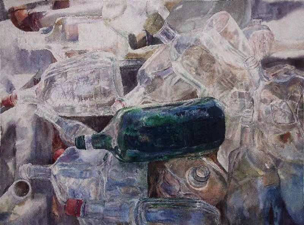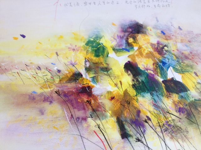 In meinen Arbeiten benutze ich häufig Aquarellfarben und chinesische Farben. Ich benutze diese Materialien einerseits wegen ihres Bezugs zur traditionellen chinesischen Kultur. Ich kann meiner eigenen Kultur nicht ausweichen und gehe auch in meinen Arbeiten immer von ihr aus. In der chinesischen Malerei ist der Maler wie die Media der Natur, der Maler drückt durch Malerei den Geist der Natur aus. Da gibt es eine Form, die sowohl figurativ als auch abstrakt ist. Das ist die traditionelle chinesische Wahrnehmung: eine Darstellungsform zwischen Nachahmung und Loslösung von der Realität. Die Darstellung der eigener Persönlichkeit und die Einfühlung in die dargestellten Gegenstände werden miteinander verbunden. Dies stimmt auch mit dem Geist des traditionellen chinesischen Xieyi-Stils (den Sinn äußern) überein. Und es gibt in der chinesischen Malerei auch eine andere Form der Perspektive: Diese Perspektive hat nicht einen Fluchtpunkt sondern viel Punkte. Es ist eine Art Perspektive des Herzens. Der Maler und die Zuschau sind immer enthalten. Eine solche Perspektive lässt mich unter die Oberfläche sehen und schauen, was mich eigentlich bewegt: das Unaussprechliche, was dennoch gesagt werden möchte, das, was mich veranlasst zu suchen, was ich in meinen Arbeiten äußern möchte, im Laufe der Zeit bin ich immer empfindlicher für Wasserfarben und Tusche. Mehrere Farbschichten komponieren auf dem Papier oder auf Leinwand einen tiefen mystischen Farbenraum, nicht wegen des Farbtons an sich, sondern vielmehr wegen der Eigenschaften der Farben.