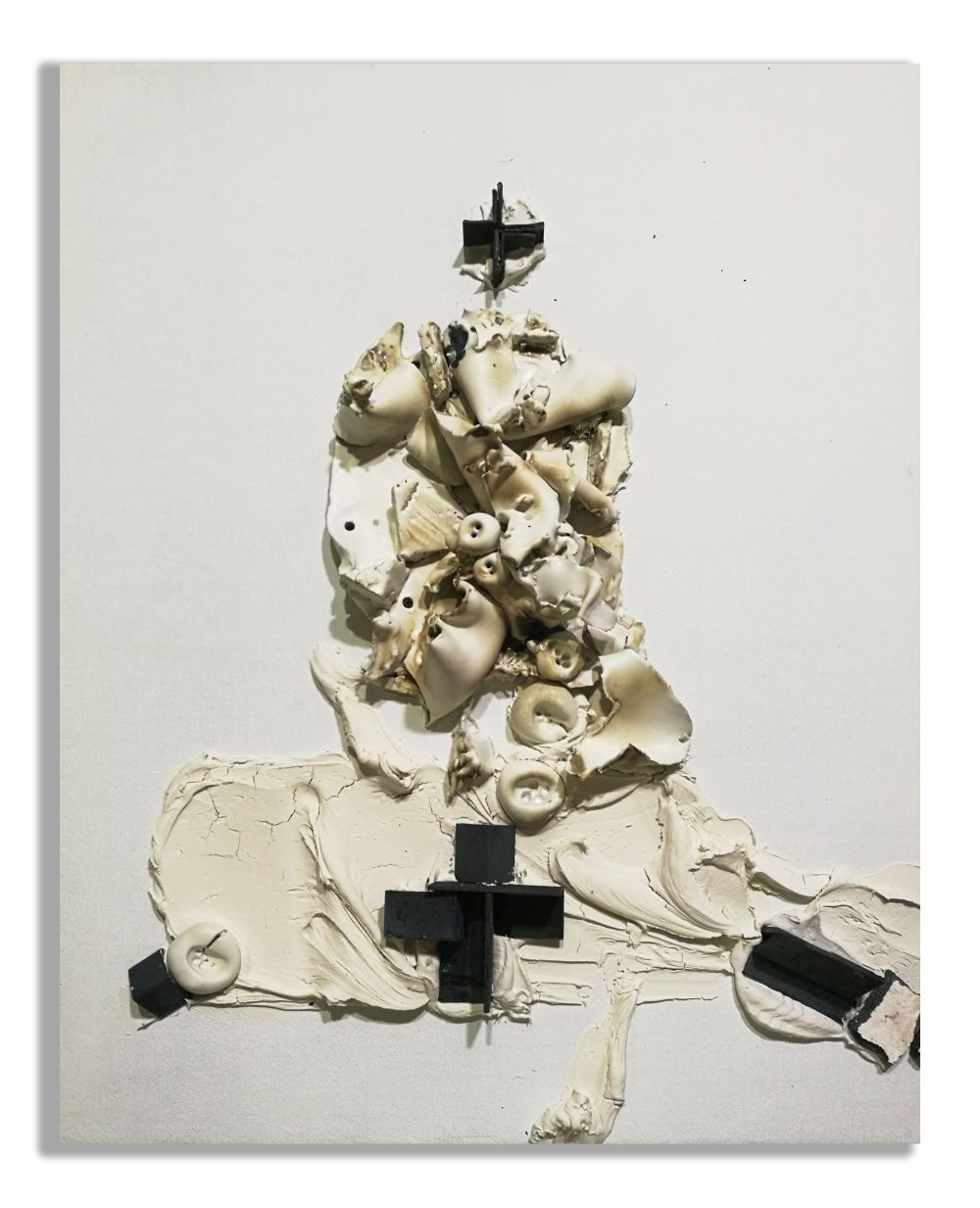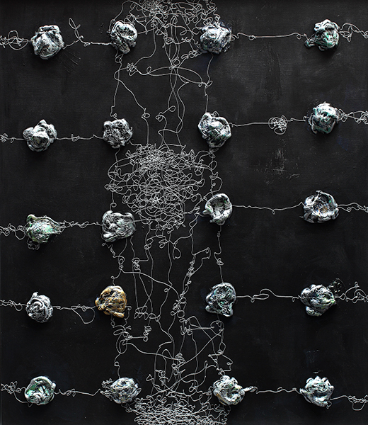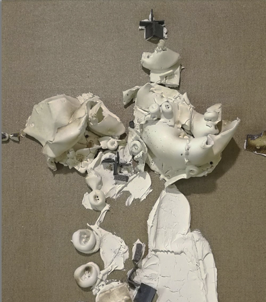 „Wiedergeburt HT No. 06″ , 2017 – 2019, Keramik/Stahl/Eisennägel auf Leinen,